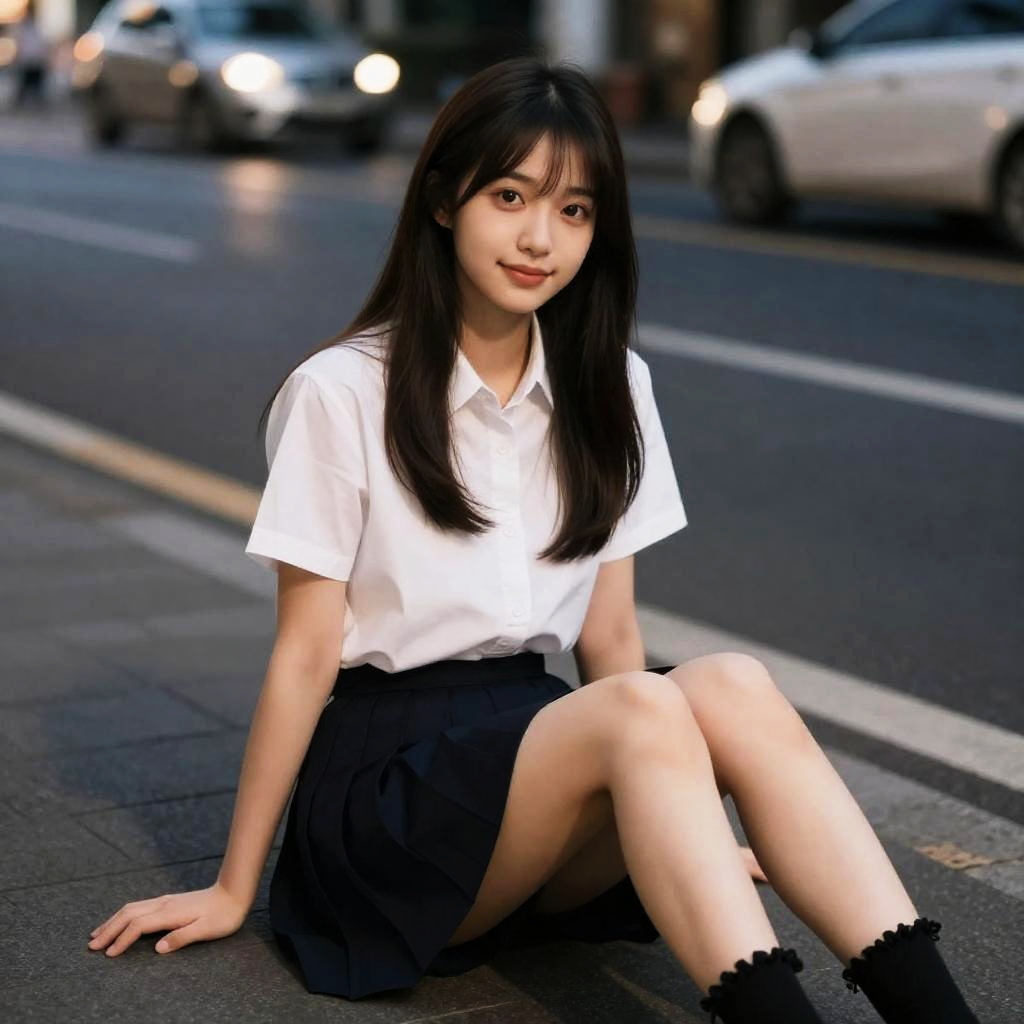 Photograph of an Asian woman with long black hair, sitting on a city street at dusk, wearing a white shirt, black skirt, and black socks