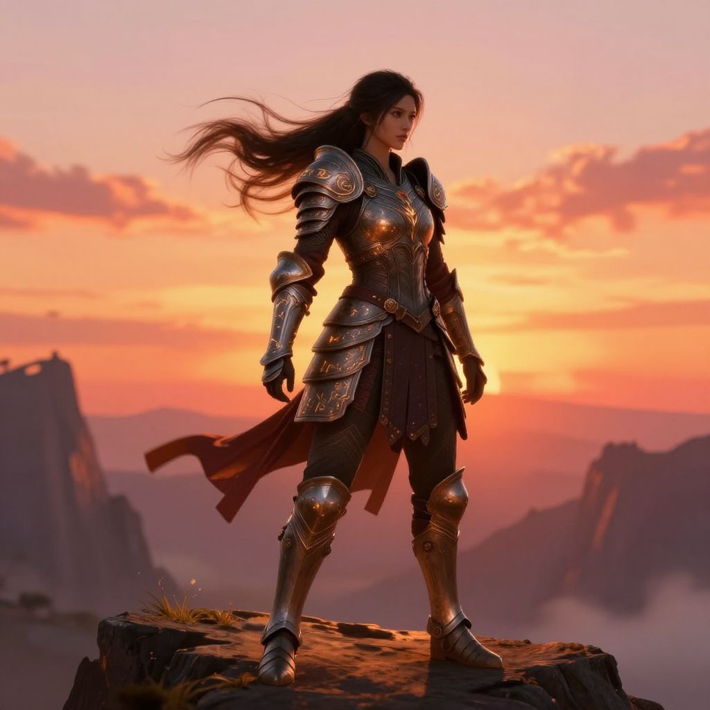 Character art female warrior standing on a cliff during sunset, detailed armor with glowing runes, flowing hair caught in the wind, fantasy landscape background, vibrant colors, cinematic lighting, highly detailed digital painting style