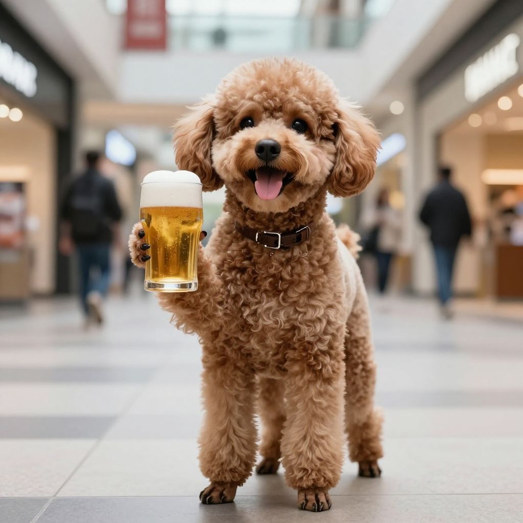 Photograph of a fluffy, light brown poodle standing in a brightly lit shopping mall corridor. The poodle, with curly fur and dark eyes, holds a glass of golden beer in its right paw, tongue hanging out playfully. It wears a black collar. The background is blurred, showing people walking and storefronts with illuminated signs. The poodle is centered in the image, with soft, warm lighting highlighting its fur texture. The scene exudes a humorous, whimsical atmosphere.