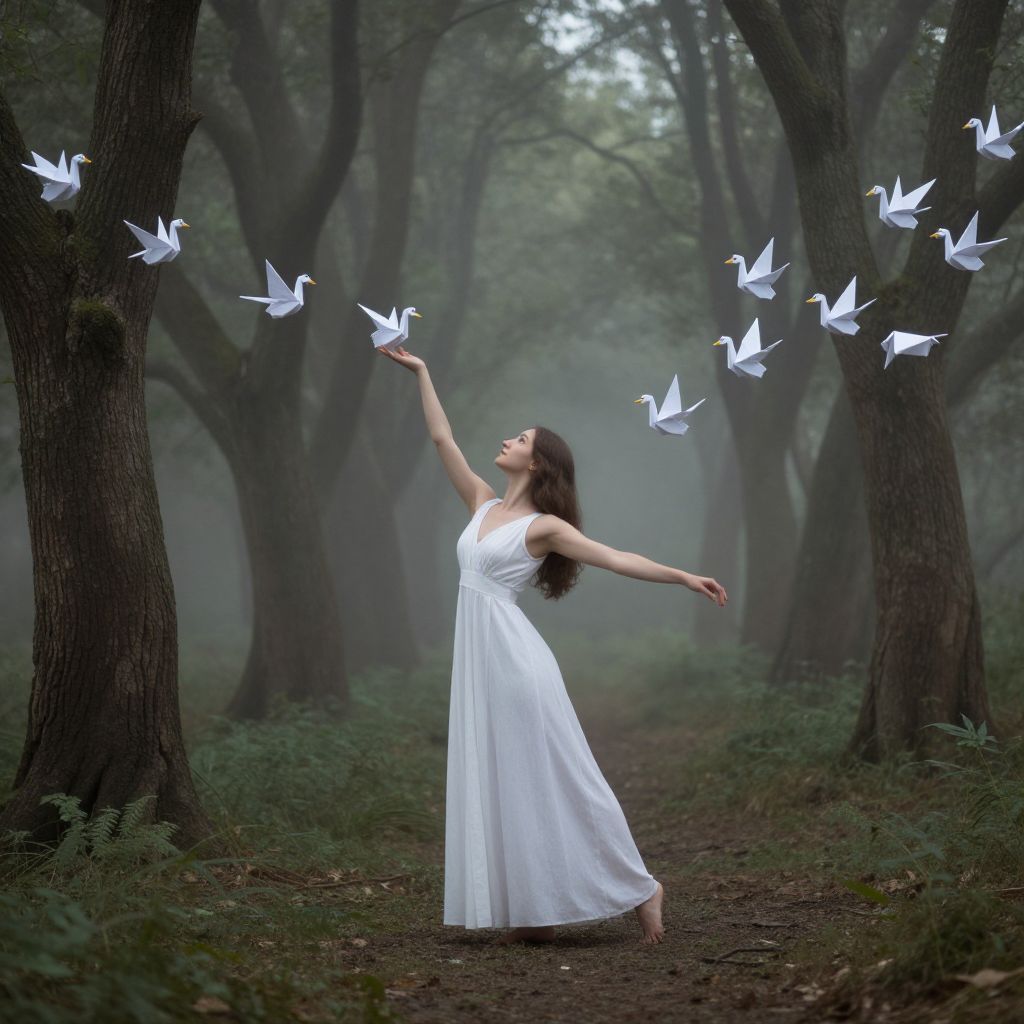 In a mystical forest shrouded in mist, a woman in ethereal white stands barefoot, her arms outstretched as if embracing the flight of origami swans, symbolizing the delicate balance between freedom and serenity, while the whispers of the ancient trees echo the timeless dance of life and transformation.