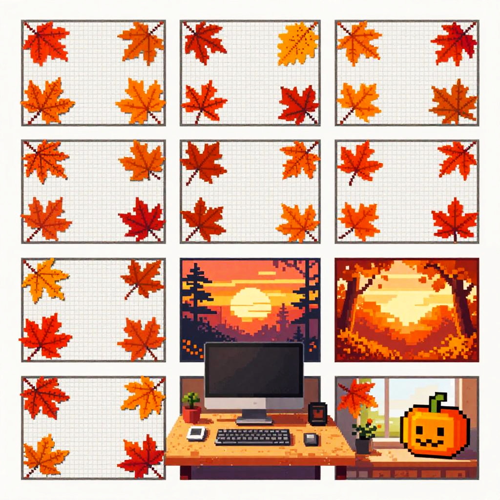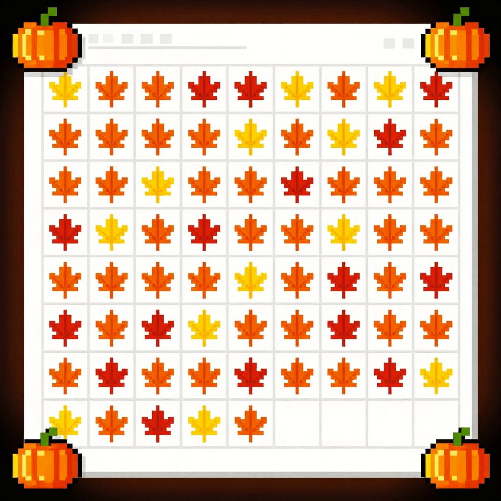 Fall-inspired spreadsheet pixel art featuring rows of orange, yellow, and red blocks representing autumn leaves, pixel pumpkins at corners, vintage computer screen effect, soft glowing light, crisp and clean grid lines, nostalgic pixel art autumn harvest theme