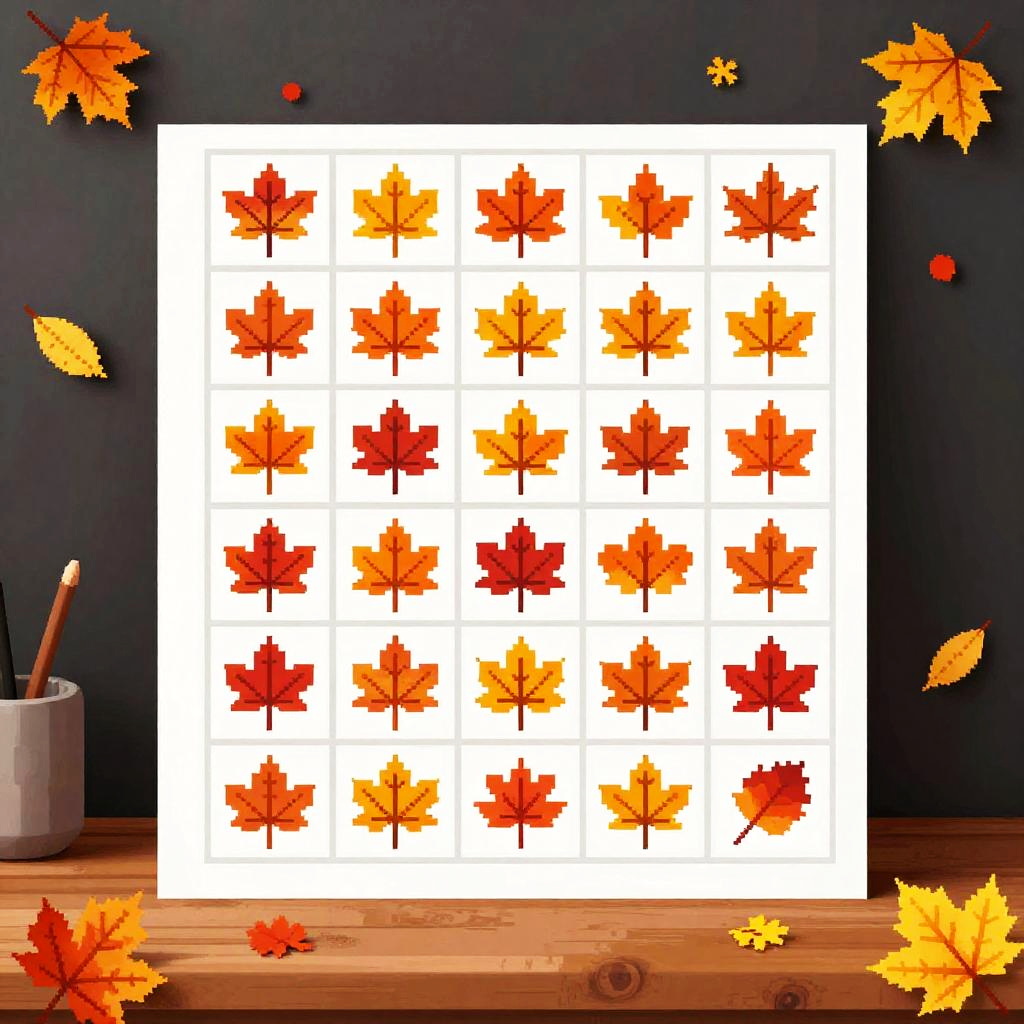 This digital pixel art image depicts a grid of 36 maple leaves in shades of red, orange, and yellow, arranged in a 6x6 pattern on a white background. Each maple leaf is a distinct pixelated shape with visible veins. The grid is bordered by four pixelated orange pumpkins, one in each corner. The overall style is reminiscent of classic video game graphics, with a bright and vibrant color palette that evokes an autumn theme. The background outside the grid is black, providing a stark contrast to the white grid and colorful leaves.