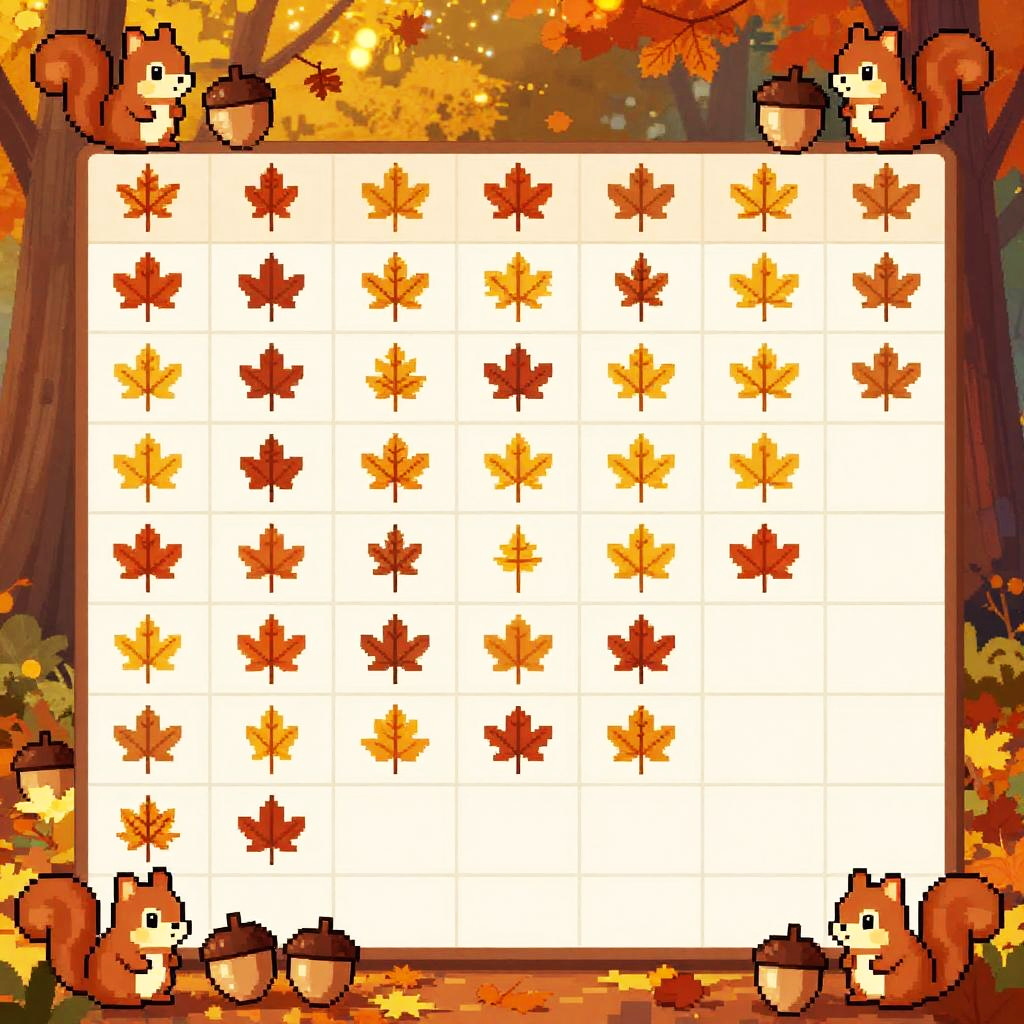 Pixel art grid of colorful autumn leaves (red, orange, yellow) arranged in a square, bordered by four small orange pumpkins.