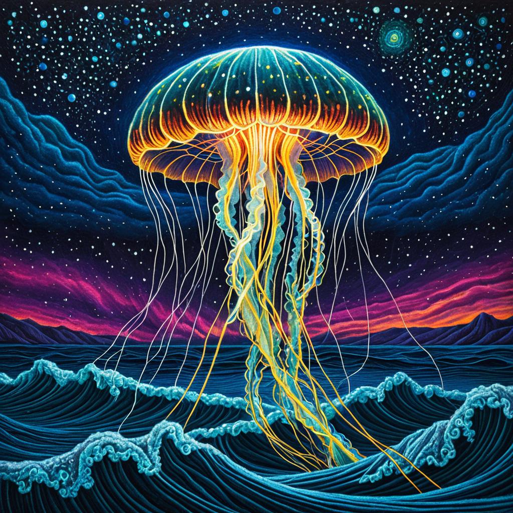 Felted cosmic electric jellyfish fine-structure, intricate detail, brilliant colors, epic composition, style of Alex Grey, bioluminescent waves, aurora borealis, incandescent