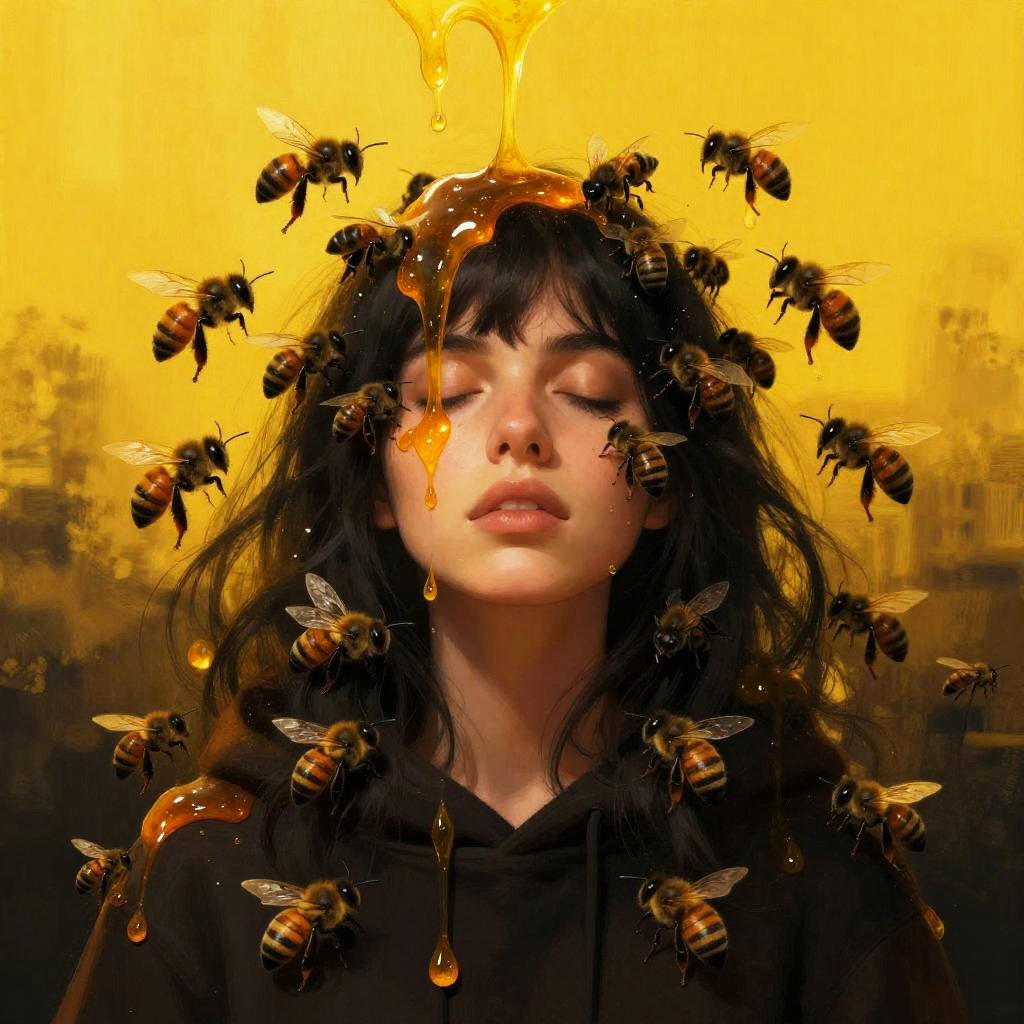 This is a digital artwork showing a dark-haired woman with her eyes closed, surrounded by numerous black bees and honey drips against a vibrant yellow and black background. The bees are scattered around her head and upper body, while honey drips down from above. The woman is wearing a dark hoodie, partially obscured by the honey. The overall style is surreal and dramatic.