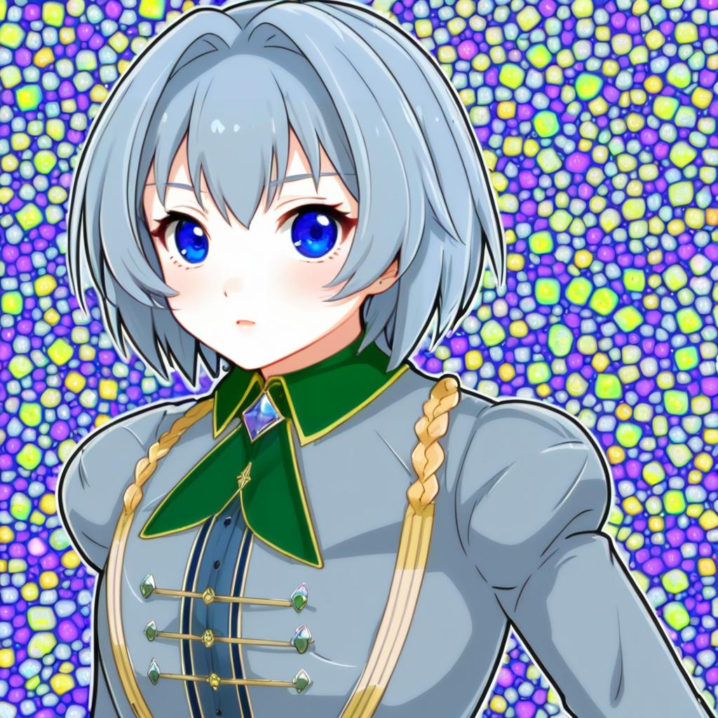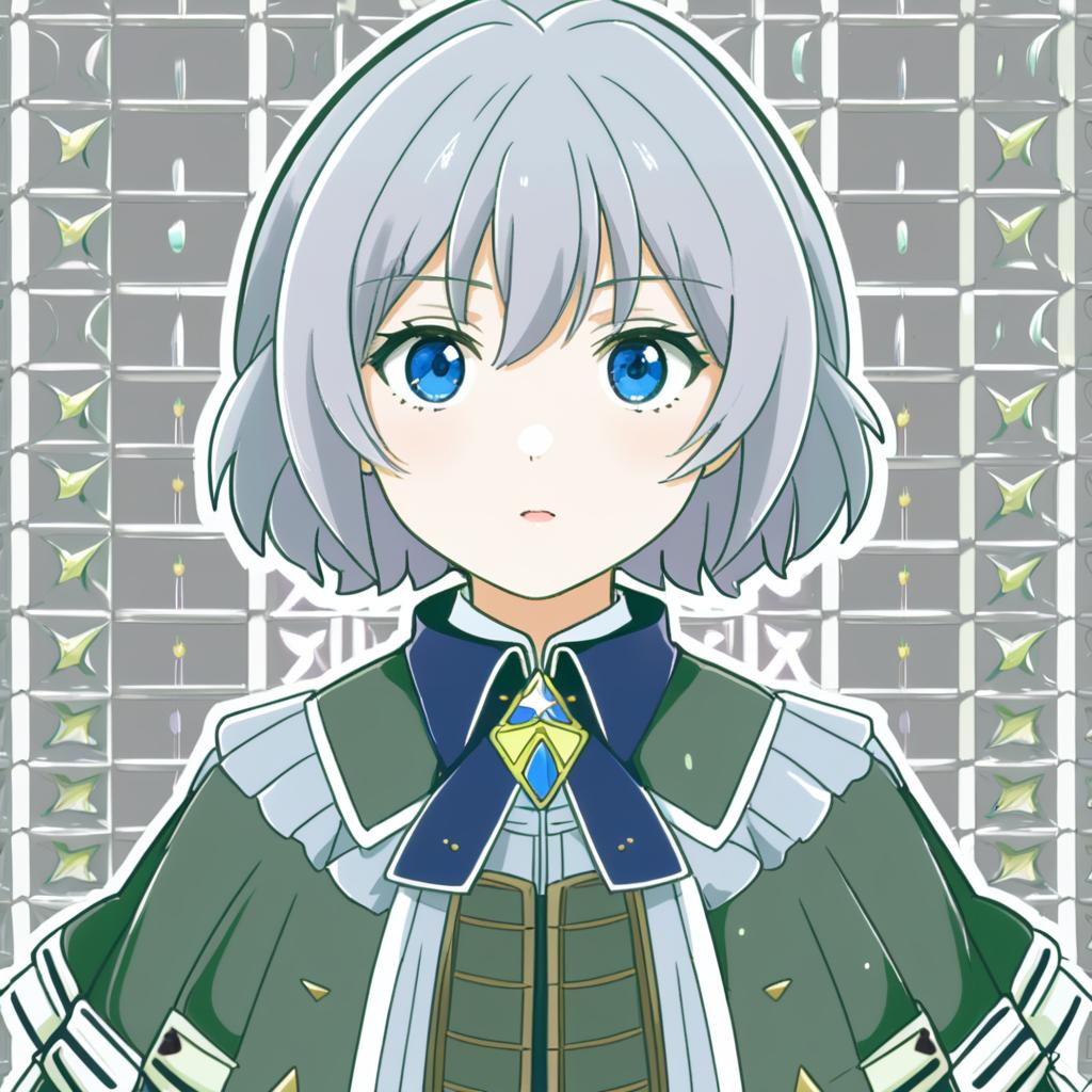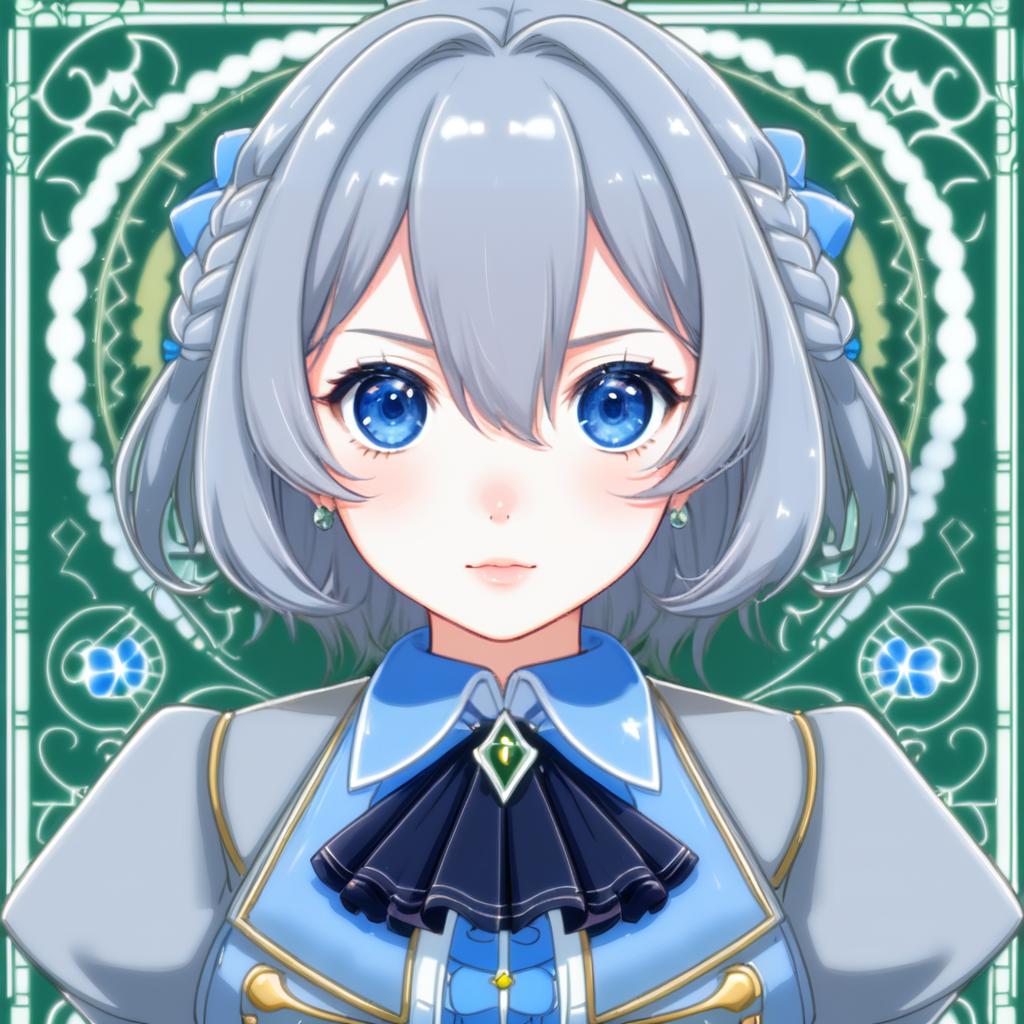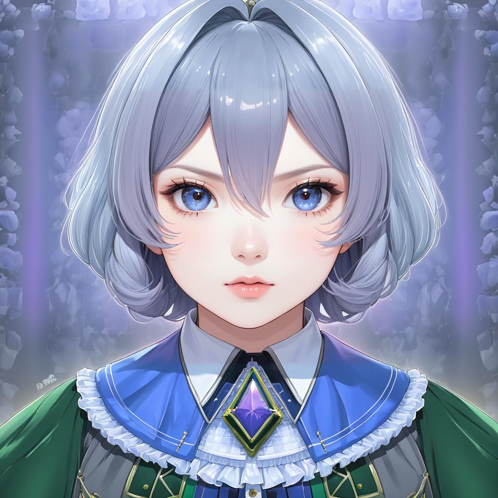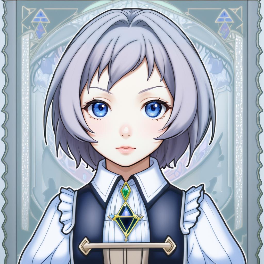 Digital anime-style illustration of a young girl with short grey hair and bright blue eyes. She wears a detailed outfit resembling a uniform with a white shirt, ruffled sleeves, and a dark vest adorned with a decorative, jewel-like pendant. The background features soft, intricate patterns with muted blue and grey tones.