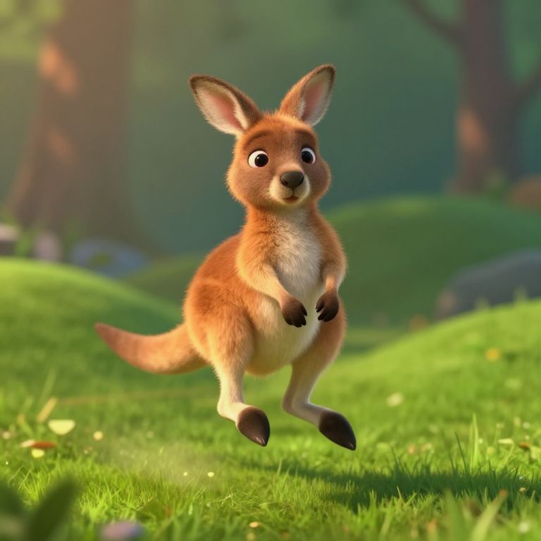 CGI image of a cute, animated kangaroo with big eyes, jumping in a sunny, green forest with blurred trees in the background.