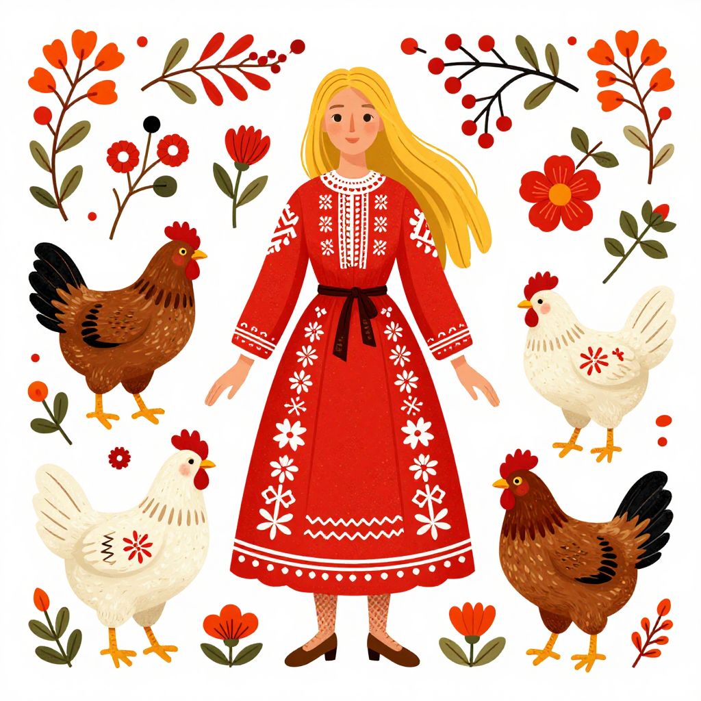 This is a colorful digital illustration depicting a blonde woman in a traditional red dress with white floral embroidery, standing centrally surrounded by four chickens. The dress has long sleeves and a black ribbon at the waist. The chickens, two brown and two white, are positioned at the bottom left, bottom right, top left, and top right. The background is white, adorned with red and orange flowers, green leaves, and small red berries. The woman has a gentle expression and wears black shoes. The illustration has a folk-art style with bold colors and simple shapes.