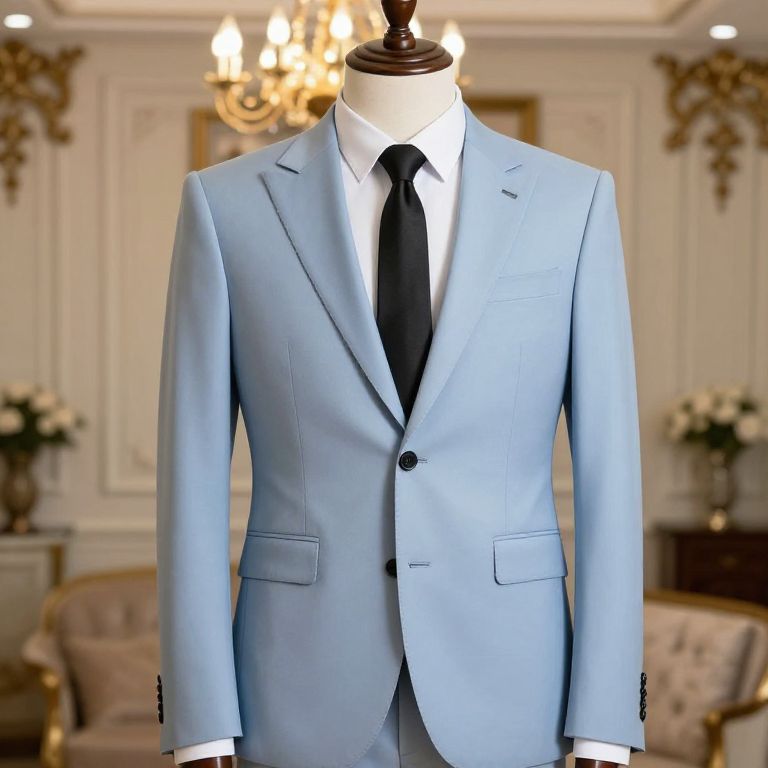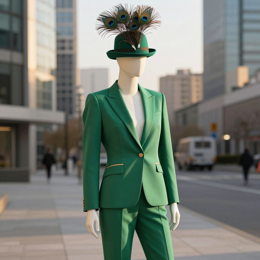 A mannequin wearing a tailored dark blue suit with a crisp green shirt and a distinctive green bow tie stands on a bustling city sidewalk. The mannequin has a neutral, lifeless expression, with a smooth, polished surface that reflects the surrounding environment. In the background, real people walk past, their movements contrasting with the stillness of the mannequin. The scene is set during a rainy afternoon, with soft golden hour lighting filtering through the clouds, creating a slightly melancholic and atmospheric mood. The sidewalk is lined with brick and concrete, and a few storefronts with colorful signs add depth to the urban setting.