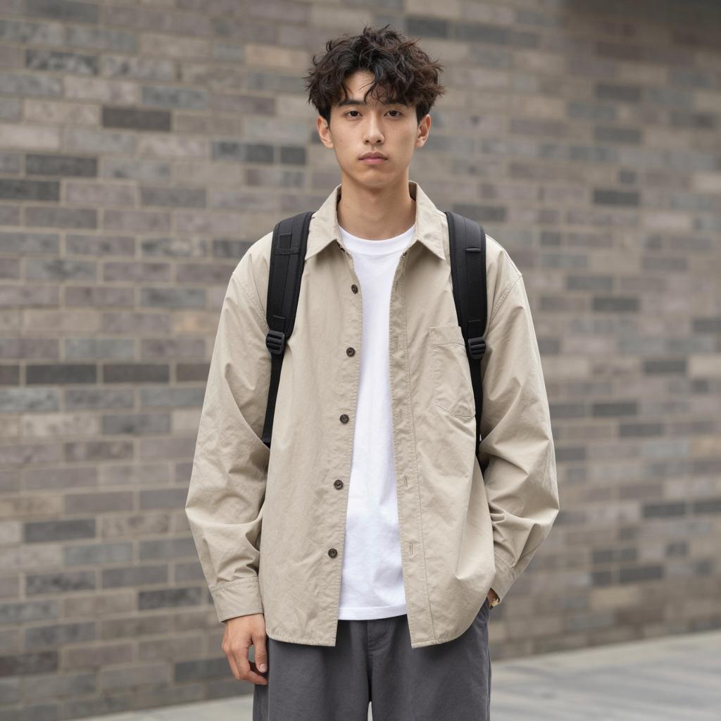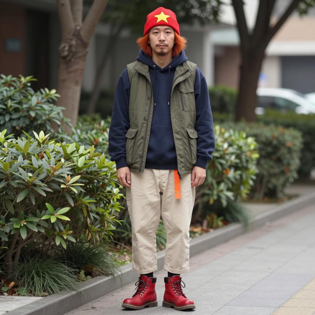 Grown ups costume party, photorealistic street style photo, young man, urban background, daytime, standing on sidewalk, neutral expression, wearing grey hooded jacket with hood up, tan cargo pants, red and white high-top sneakers, hands in pockets, modern cityscape, blurred background with people, green tree foliage on right, glass storefronts on left, realistic lighting, casual fashion, medium shot, front view, balanced composition, natural colors