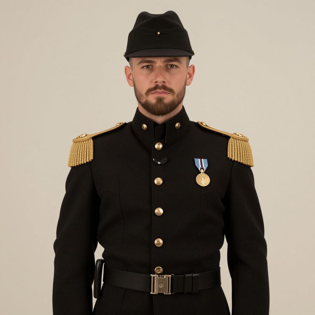 Photograph of a white man with a beard and mustache, wearing a black military uniform with gold epaulettes and a black cap. The uniform has gold buttons and a black belt with a silver buckle. He has a blue and gold medal on his left chest. The background is a plain white, making the subject stand out. His expression is neutral, and he is standing straight, facing the camera. The lighting is even, highlighting the details of his uniform and facial features.
