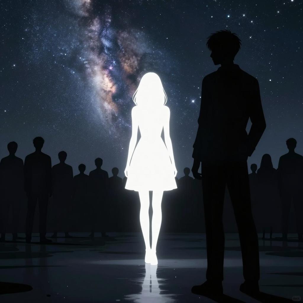 Illustration of a starry night sky. A brightly lit, white silhouette of a woman in a short dress stands center, reflecting on wet ground. A dark silhouette of a man with a jacket and pants stands to her right. Silhouettes of a crowd are in the background. Milky Way galaxy stretches across the sky. The man looks at the woman. Wet ground and silhouettes are in shadow.