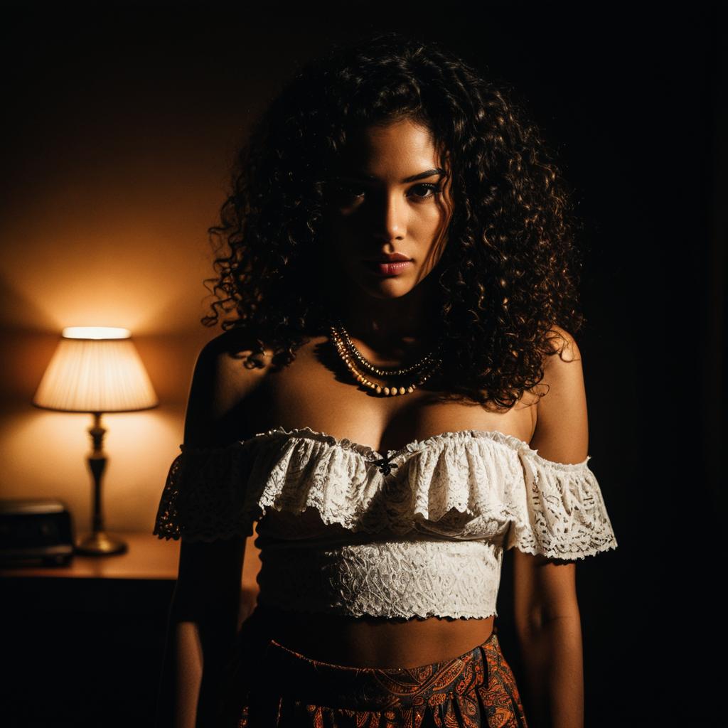 Photorealistic portrait of young man with curly hair in misty mountain range at dawn, wearing an ivory off-shoulder cropped lace top with delicate ruffle detailing and a long fitted paisley patterned skirt, accessorized with layered necklaces and thin bangle bracelets, soft cinematic lighting, shallow depth of field, dreamy atmosphere. --sref 1404