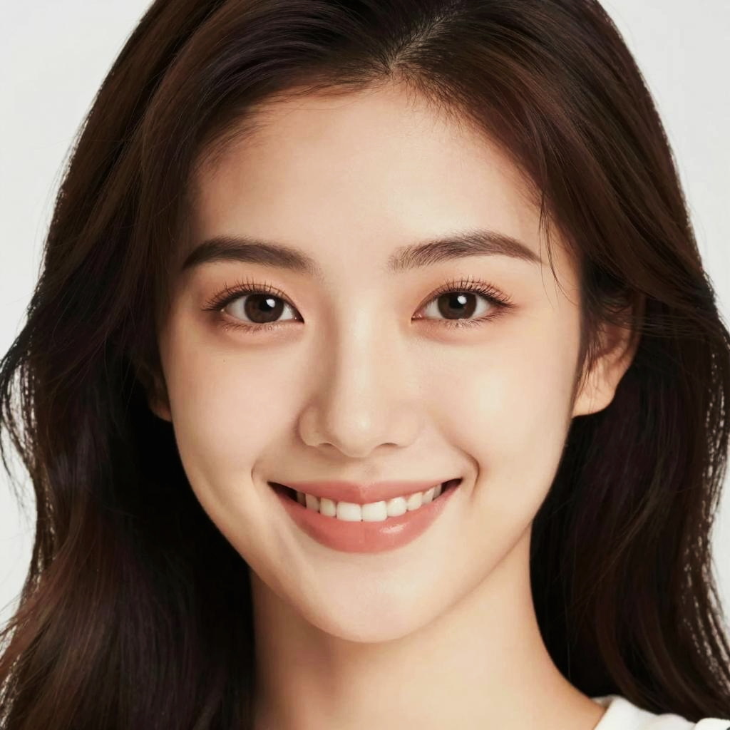 Studio close-up portrait of a young Asian woman with long dark hair wearing a white spaghetti strap top. She has smooth, clear skin and a neutral expression, looking slightly to the side against a plain gray background.