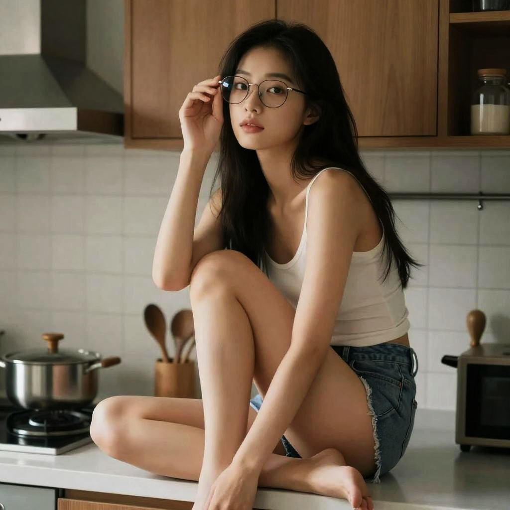 Photorealistic image of a young East Asian woman sitting barefoot on a kitchen counter. She is wearing round glasses, a white sleeveless top, and denim shorts. The kitchen background includes wooden cabinets, a stainless steel pot on the stove, cooking utensils, and a microwave.
