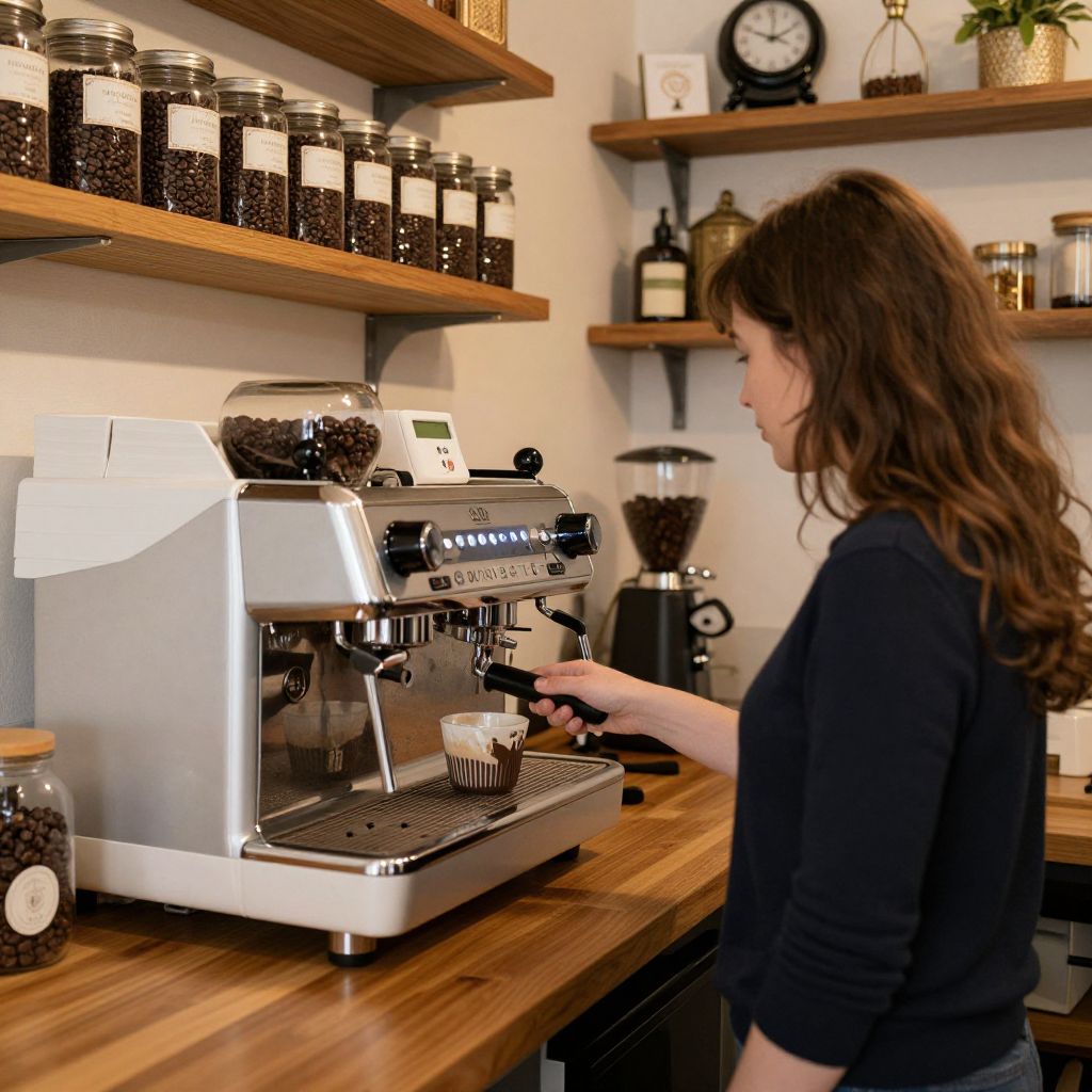 Woman operating a coffee machine in a cozy café setting, surrounded by shelves stocked with jars of coffee beans and a warm wooden countertop featuring a clock and decorative items.