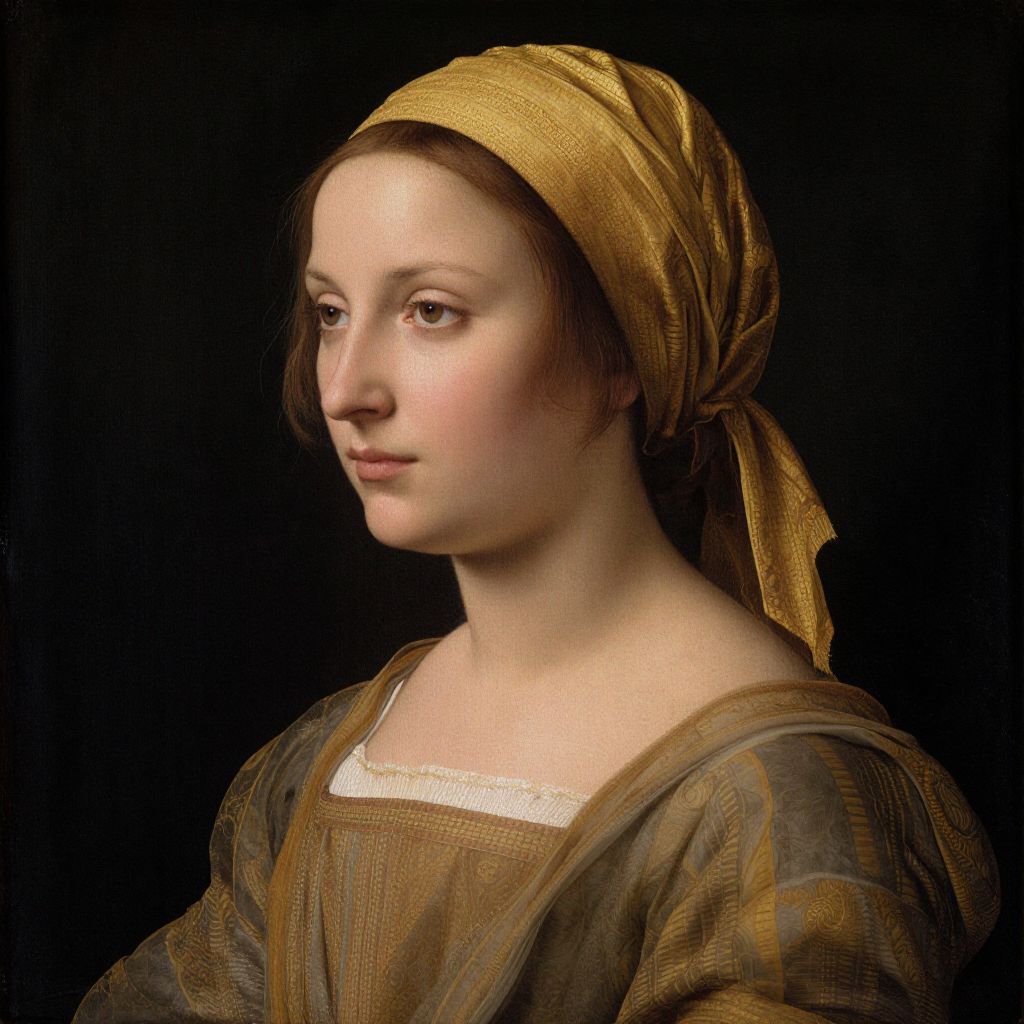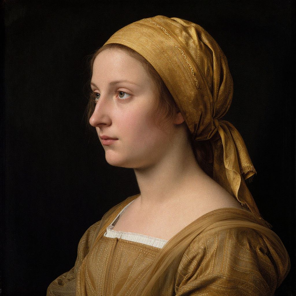 Renaissance-style portrait of a young woman with fair skin, brown eyes, and a golden headscarf, wearing a brown and beige patterned