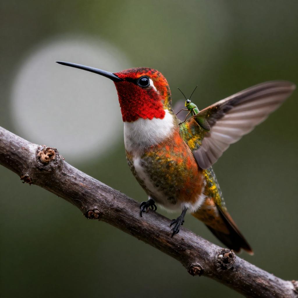 A digital artwork of a vibrant, red and yellow hummingbird with a long beak, perched on a dark, ured tree trunk. A small, green insect with wings is clinging to the hummingbird's back. The background is blurred with bright green and white light spots. The image has a dramatic, high-contrast lighting effect.