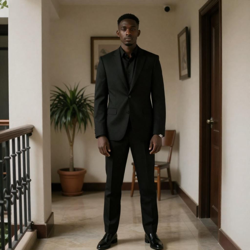 Photograph of a dark-skinned man in a black suit standing in a dimly lit hallway. He has short black hair and a serious expression. Background includes a potted plant, wooden chair, framed picture, and marble floor. Shadows cast on the wall. Balcony railing in the foreground.