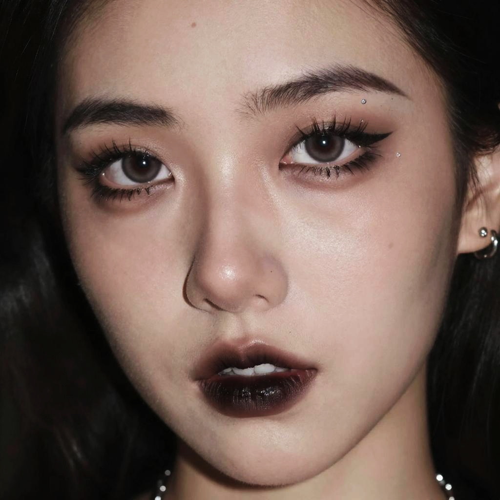 Close-up portrait of a stylish Asian goth girl with dark makeup including black lipstick, smoky eyeshadow, mascara, and eyeliner. She features unique facial piercings with ornate silver jewelry on her eyebrow and ear. The image showcases detailed skin texture, shiny skin, and a defined jawline, shot with harsh flash lighting and sepia tone for a grainy, edgy vibe.