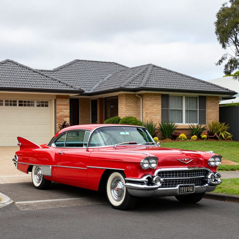 Shiny 1959 Cadillac Series 62 Coupe DeVille in Candy Red custom-built for show, featuring a 390ci V8 engine, parked in front of a suburban home with manicured landscaping in Carrum Downs, Victoria, Australia.