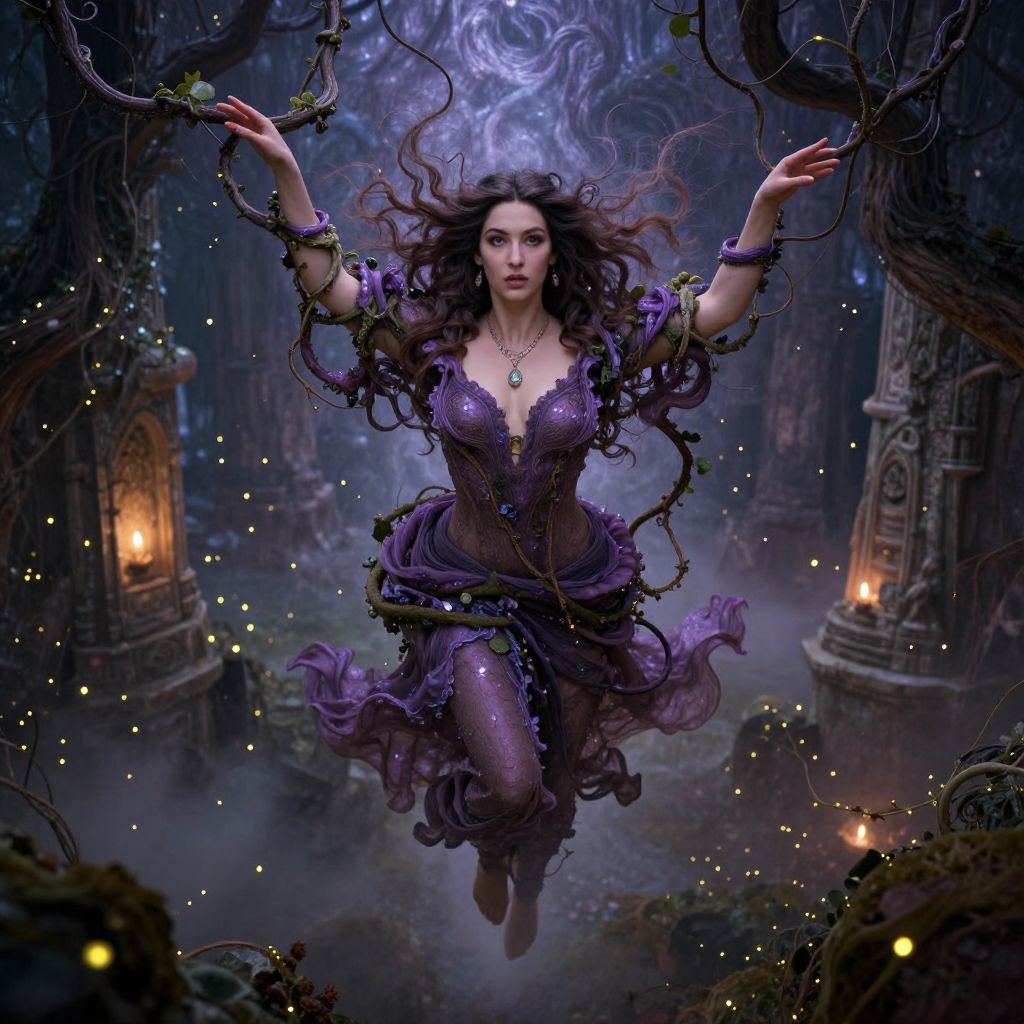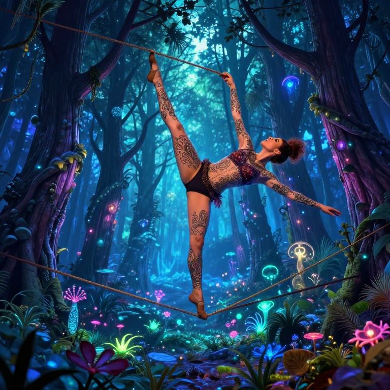 An avant-garde digital art piece depicting an enthralling circus performance from a unique perspective, showcasing intricate and swirling tattoos on the skin of a tightrope walker as she gracefully performs acrobatics above a mesmerizing forest floor. The scene is illuminated by an ethereal light show, casting an otherworldly glow on her maneuvers, evoking a sense of awe in the observer as she balances precariously over a bio-luminescent landscape.