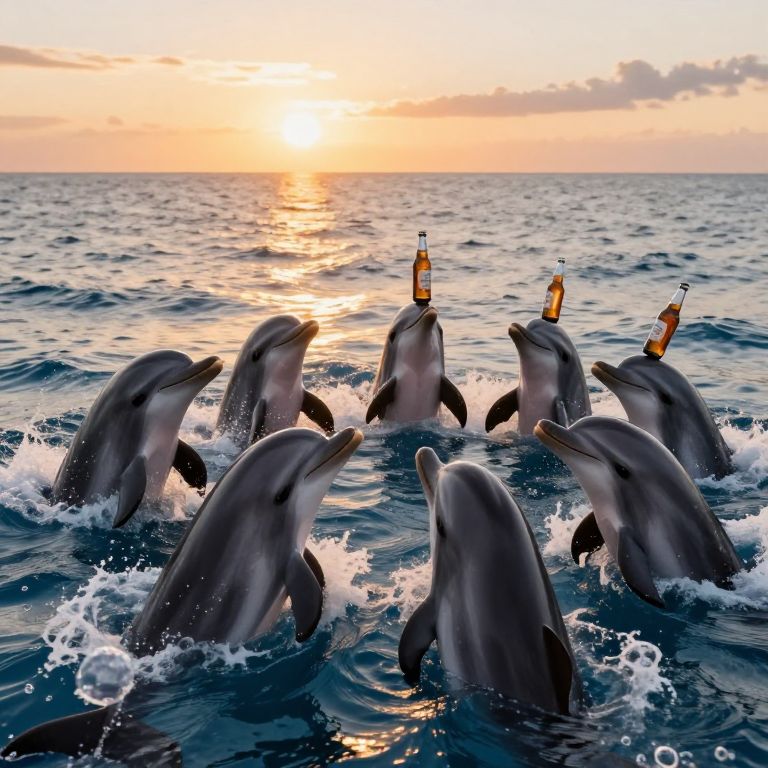 Imagine a playful group of dolphins in the middle of the ocean, gathered in a circle, each holding bottles of beer in their flippers, The sun is setting on the horizon, casting a golden glow across the water, while the dolphins laugh, splash, and pass the beers around, Some are playfully balancing the bottles on their noses, while others take turns diving through the waves, The scene is lighthearted and comical, with frothy waves and beer bubbles mingling in the ocean as the dolphins enjoy their carefree party at sea