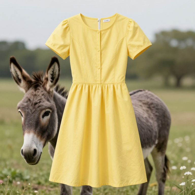 Photograph of a yellow, short-sleeved, button-up dress with a gathered waist, displayed in front of a donkey standing in a grassy field. The dress, hanging without a mannequin, contrasts with the donkey's gray and white fur. The background includes a blurred, green, and brown landscape with trees and wildflowers. The donkey has large, dark ears and a white stripe on its face, looking towards the camera. The image has a bright, outdoor setting, emphasizing the vibrant yellow dress against the natural, earthy tones.