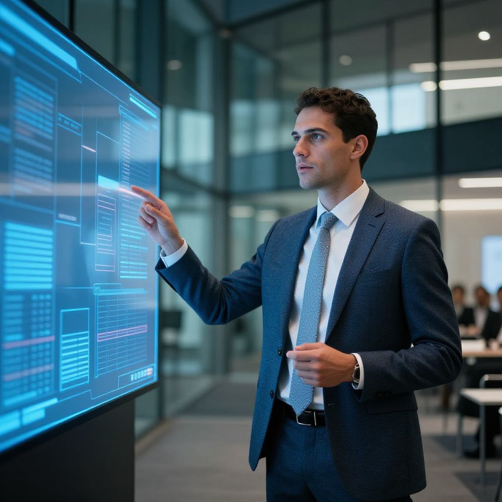 Photograph of a young, light-skinned man with dark, short hair, wearing a dark blue, textured suit, white dress shirt, and silver tie. He is standing in a modern, glass-walled office, pointing at a large, illuminated blue touchscreen display with white text and icons. The background shows blurred office furniture and other people, creating a professional and tech-savvy atmosphere. The man has a focused expression, and the blue light from the screen contrasts with his dark suit. The image has a sharp, professional quality with a shallow depth of field.