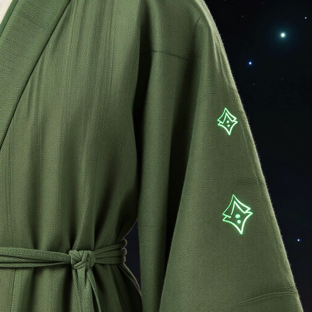 Close-up of green Jedi robes fabric texture with subtle glowing symbols, futuristic galaxy setting, soft ambient lighting highlighting intricate embroidery, ultra detailed