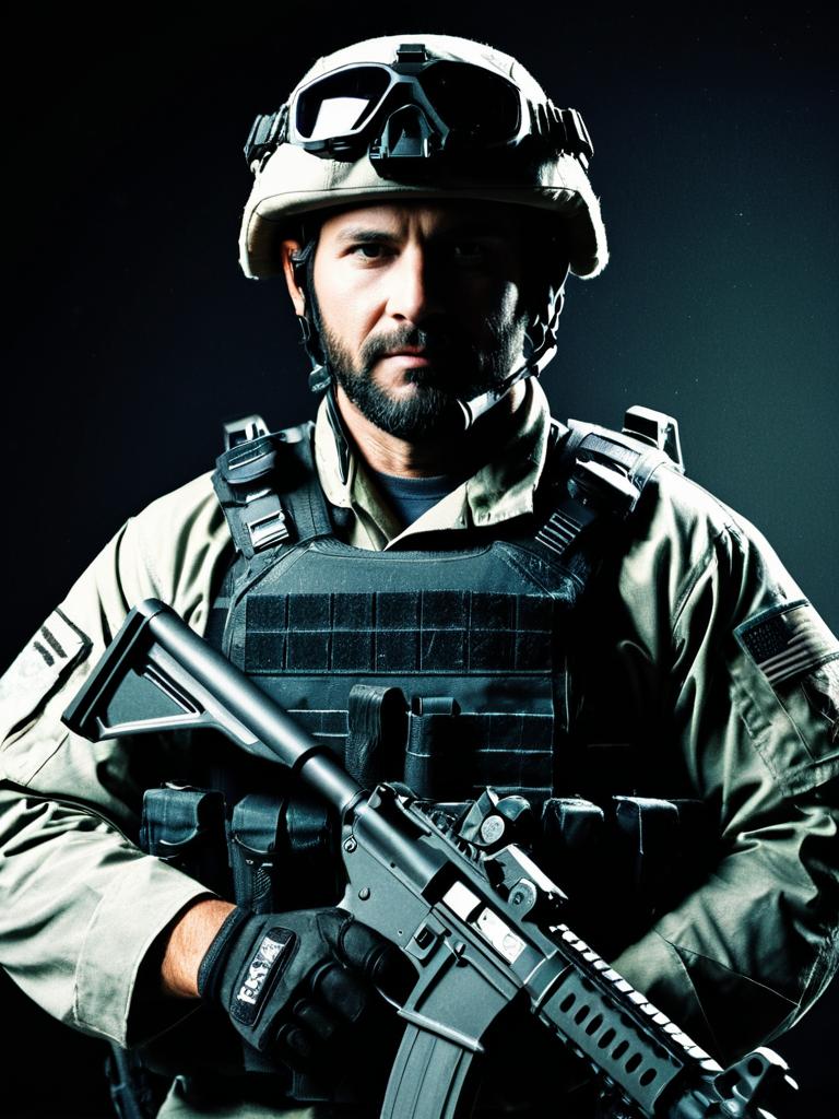 Photorealistic studio portrait of a man dressed in Seal Team Six raid tactical gear, including helmet with goggles, camouflage uniform, and tactical vest, holding an assault rifle with black gloves. The background is dark, emphasizing the soldier's focused expression and detailed equipment.