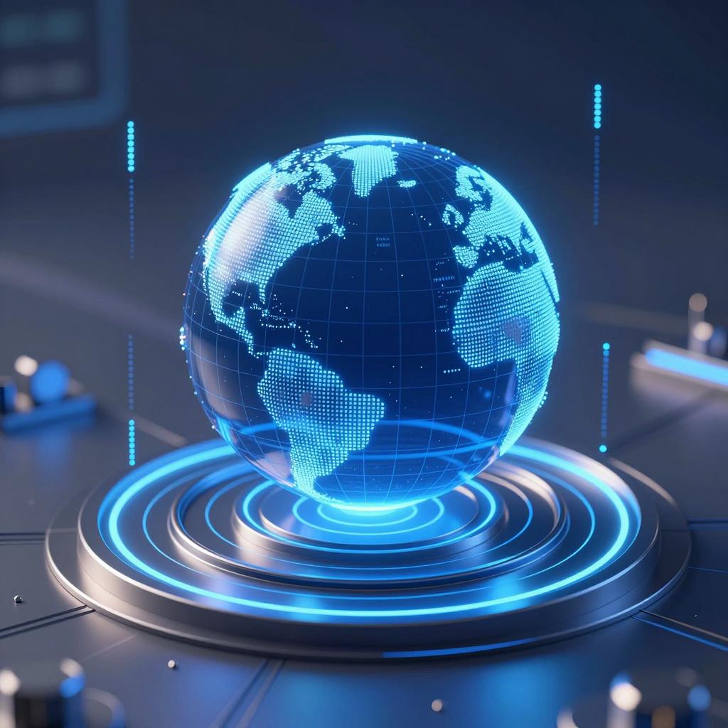High-quality 3D render of a glowing blue holographic sphere displaying a digital map of the Earth. The sphere is surrounded by circular light patterns and vertical data streams, symbolizing advanced AI data analysis and futuristic technology with metallic and digital grid textures in a dark setting.