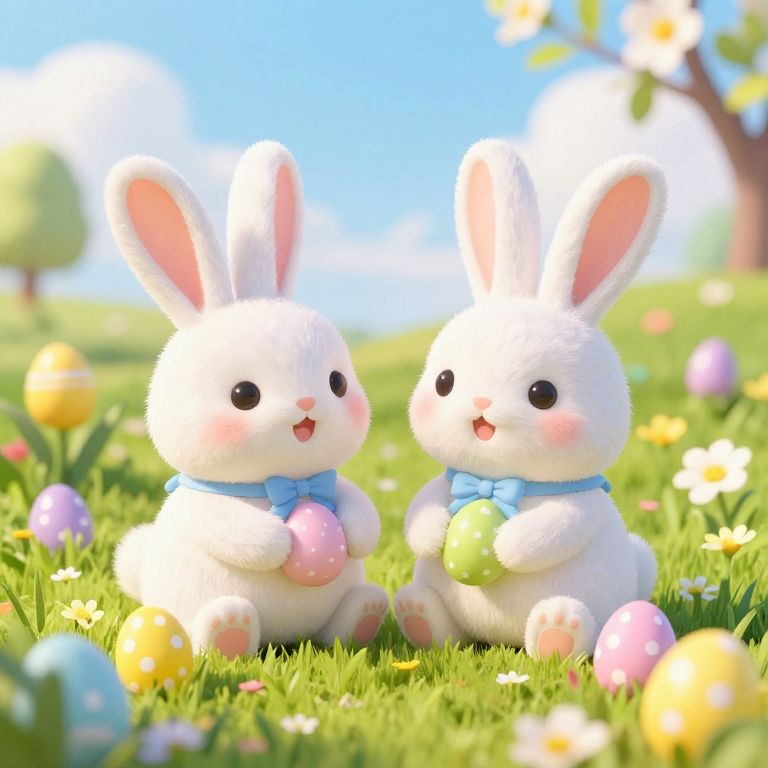 Two adorable Easter bunnies sit amidst a vibrant spring meadow, surrounded by colorful eggs and blooming flowers under a sunny sky.