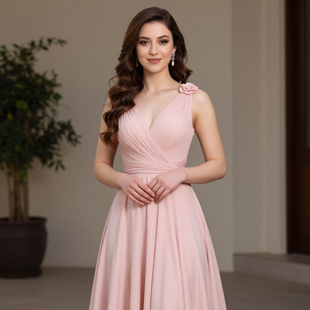 Photograph of a young woman with long, wavy brown hair, wearing a sleeveless, pale pink, V-neck ball gown with a gathered waist and a single rose embellishment on the right shoulder. She stands with hands gently clasped in front, smiling softly. Her makeup is subtle, highlighting her features with pink lipstick and dark eyeliner. She wears dangling silver earrings. The background is a softly lit indoor setting with a potted plant to the left and a white wall behind her. The dress has a flowing, elegant texture, and the overall atmosphere is sophisticated and graceful.