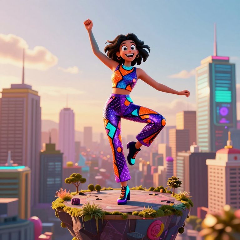 A dynamic pop art girl dancing on a floating island in a surreal cityscape, her body glowing with comic bold graphic colors — purple, orange, and cyan — her face having exaggerated features like a cartoonish smile and wide expressive eyes, wearing a sparkly polka-dot jumpsuit with geometric cutouts, the background a blend of retro city buildings and digital art elements, photographed with dramatic golden hour lighting and high-resolution detail.