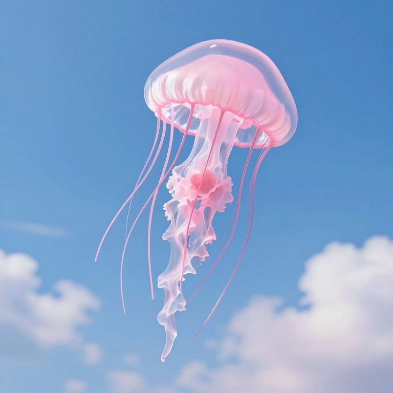 A surreal 3D-rendered jellyfish, bathed in ethereal pink hues and adorned with delicate tendrils, floats gracefully against a vivid blue sky dotted with fluffy clouds, evoking a dreamlike, otherworldly atmosphere.