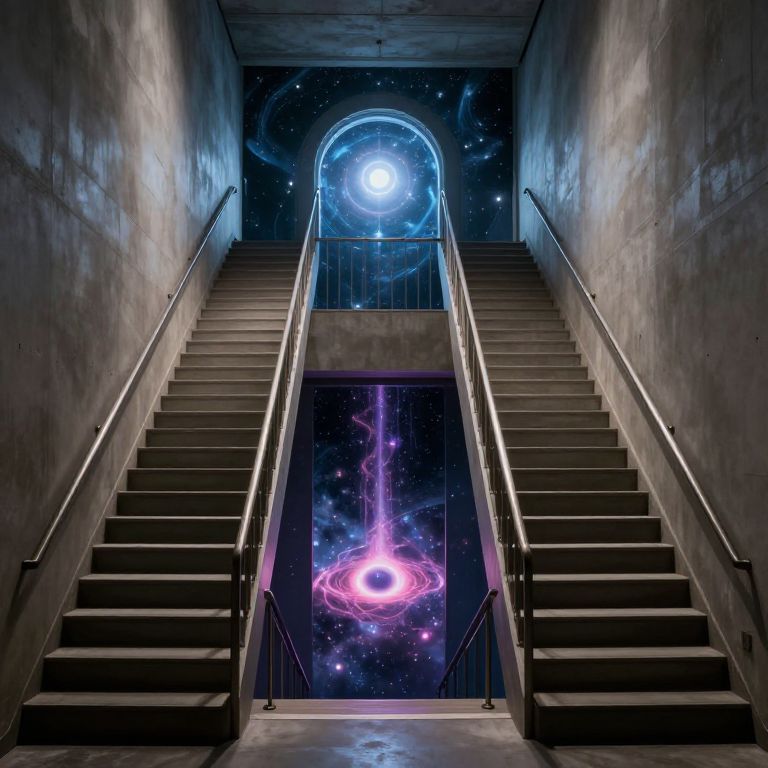 Digital art of a dark, concrete stairwell ascending to a cosmic backdrop with glowing blue and pink nebulae at the top.