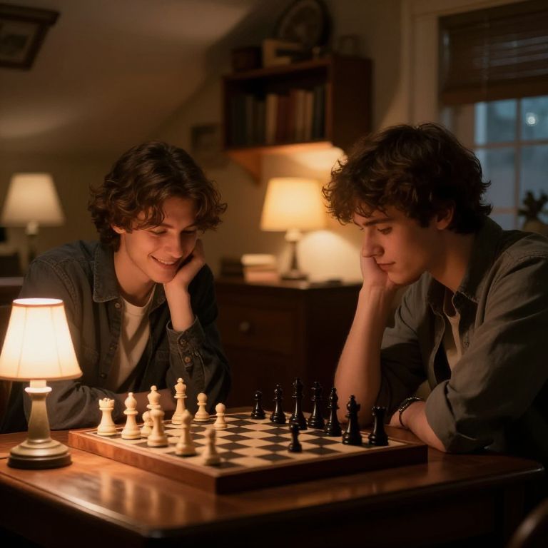 Photograph of two young men with curly brown hair, wearing dark blue shirts, engaged in a chess game in a dimly lit room. They sit at a wooden table, each resting their head on their hand, smiling thoughtfully at the board. A warm, yellow-lit lamp on the left and a slightly blurred background with shelves, books, and another lamp provide a cozy, intimate atmosphere. The chessboard is centered on the table, with black and white pieces arranged mid-game. The soft, warm lighting creates a serene and focused mood.