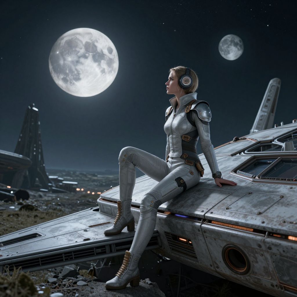 CGI image of a futuristic spacewoman in white armor, headphones, and boots, sitting on a damaged spaceship at night, moonlit sky, stars