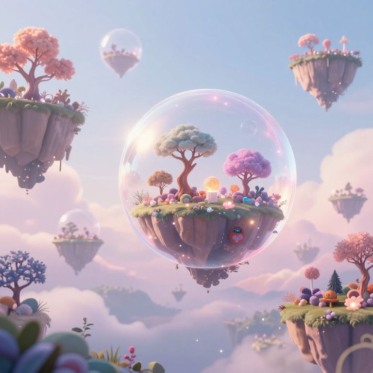 This digital artwork depicts a whimsical, fantasy landscape with floating, cliff-like islands in a pastel, dreamy sky. Central to the image is a prominent island with a tree and small, colorful buildings, surrounded by a glowing, transparent sphere. Surrounding islands have similar trees, some with pink and purple blossoms, and tiny houses. The sky is bright blue with soft, pink and purple clouds. In the background, additional floating islands and a larger sphere are visible. The scene has a magical, ethereal feel with sparkling details and vibrant colors, creating a sense of enchantment and wonder.