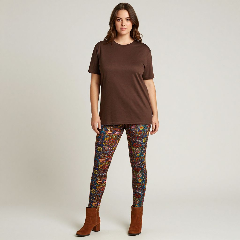 "Woman, casual, simple brown T-shirt with a loose fit and short sleeves, multicolored leggings with a vibrant and eclectic pattern, ankle-length, brown ankle boots with a modest heel.. Sexy. Pretty face and beаutiful eyes. Big breasts."