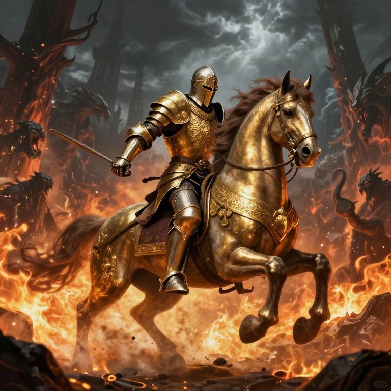 Digital artwork of a knight in shiny, gold armor riding a galloping horse through a fiery battlefield. The knight, clad in detailed, reflective armor, holds a sword in his right hand. The horse, also adorned with ornate gold tack, rears up on its hind legs. Flames and smoke engulf the scene, with dark, twisted trees in the background. Two dragon-like creatures with glowing eyes emerge from the fire on either side. The sky above is cloudy, adding to the dramatic, apocalyptic atmosphere. The image combines realistic textures with fantasy elements, emphasizing action and intensity.