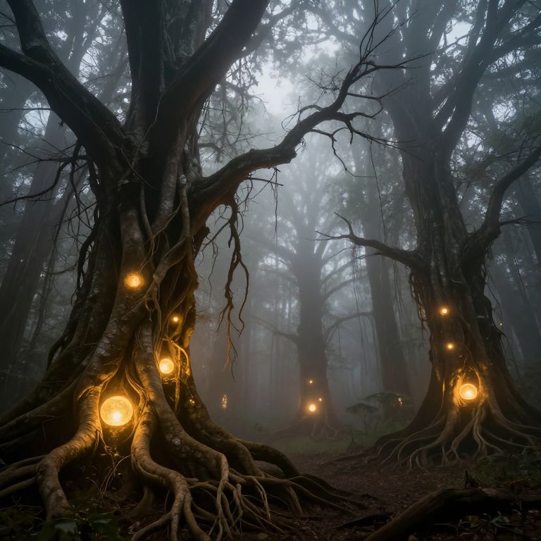 In a mist-shrouded forest where trees defy gravity, their roots cradle luminous orbs, casting a golden glow that whispers of hidden truths and eternal mysteries, while the barren branches reach toward a shimmering void, evoking a profound sense of wonder and existential contemplation.