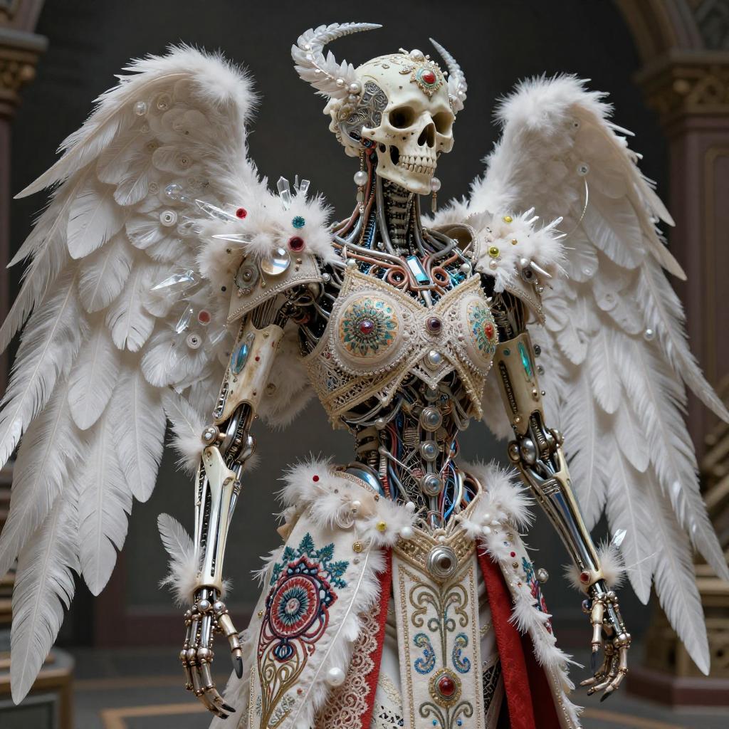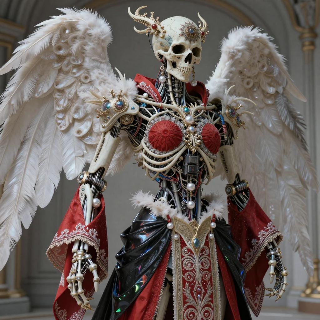 Highly detailed anthropomorphic female robot in coal-black chrome with gilded gold accents and intricate filigree. Features retractable feathered wings, luminescent vial cores, and stylized curved horns. The design combines steampunk and science fiction fantasy aesthetics, set against a smooth, chrome architectural background. The robot is sleek and articulated with a polished, super shiny surface, emphasizing hyper-realistic textures and lighting.