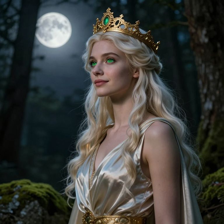 Envision an ultra-realistic portrait of an enigmatic European goddess with captivating green eyes and flowing platinum blonde hair. Bathed in the ethereal glow of a full moon, she stands amidst a dark forest, her regal cheekbones and chiseled jawline emphasized by an unconventional side angle. Gazing pensively into the distance with a knowing smile, she exudes ancient wisdom and modern allure, suggesting untold stories woven through history's tapestry. Her intricate golden crown and silk gown, cascading over moss-covered rocks, merge photorealistic precision with an otherworldly aura. This captivating portrait transcends time and space, leaving an indelible mark on the viewer.