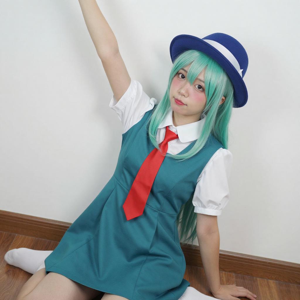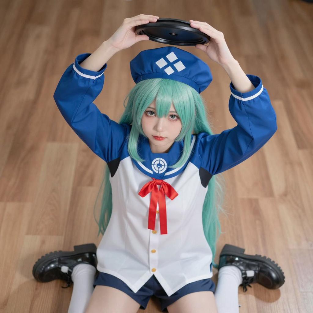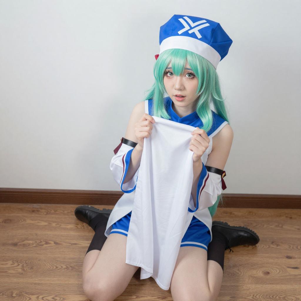 Photograph of a young woman with light green hair in a cosplay outfit, kneeling on a wooden floor. She wears a blue and white hat with a white symbol, and a white and blue sleeveless top with dark red accents. She holds a white cloth in front of her chest, looking directly at the camera with a slightly surprised expression. The background is a plain white wall.