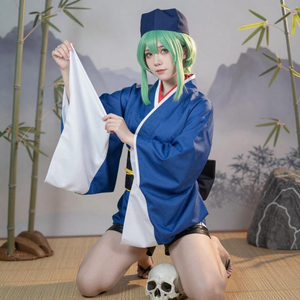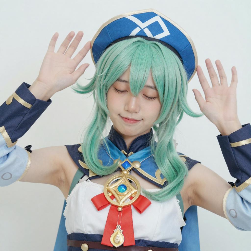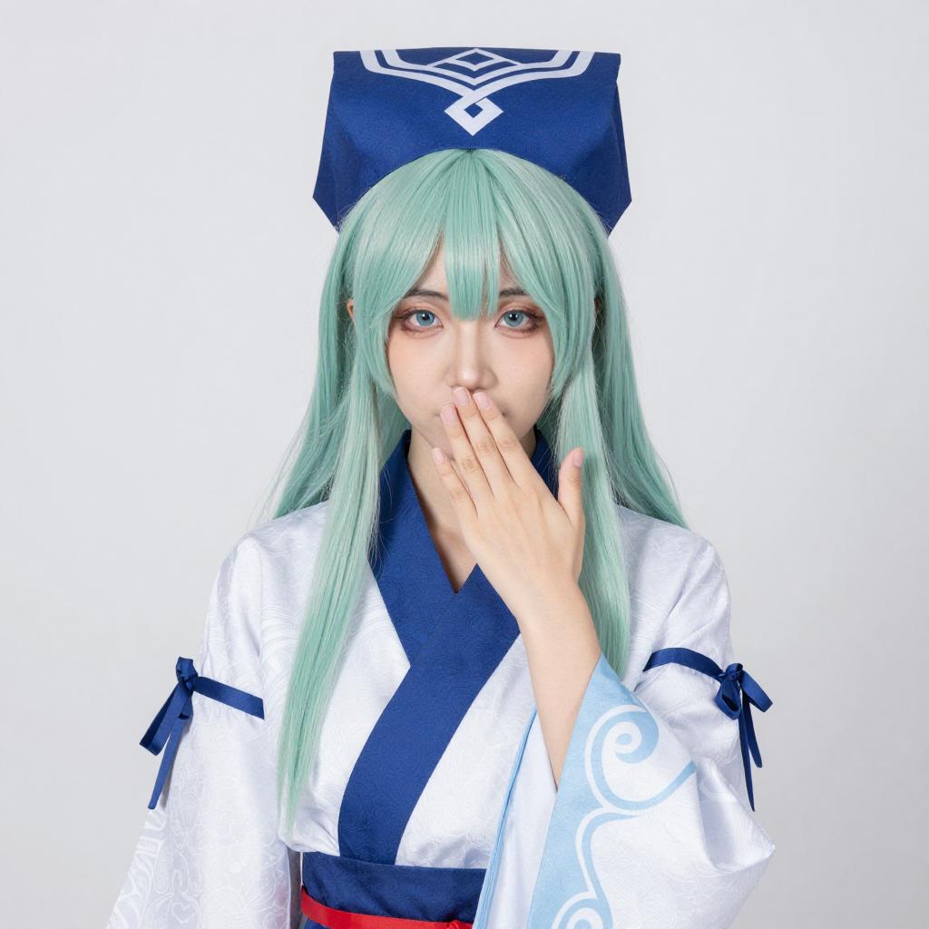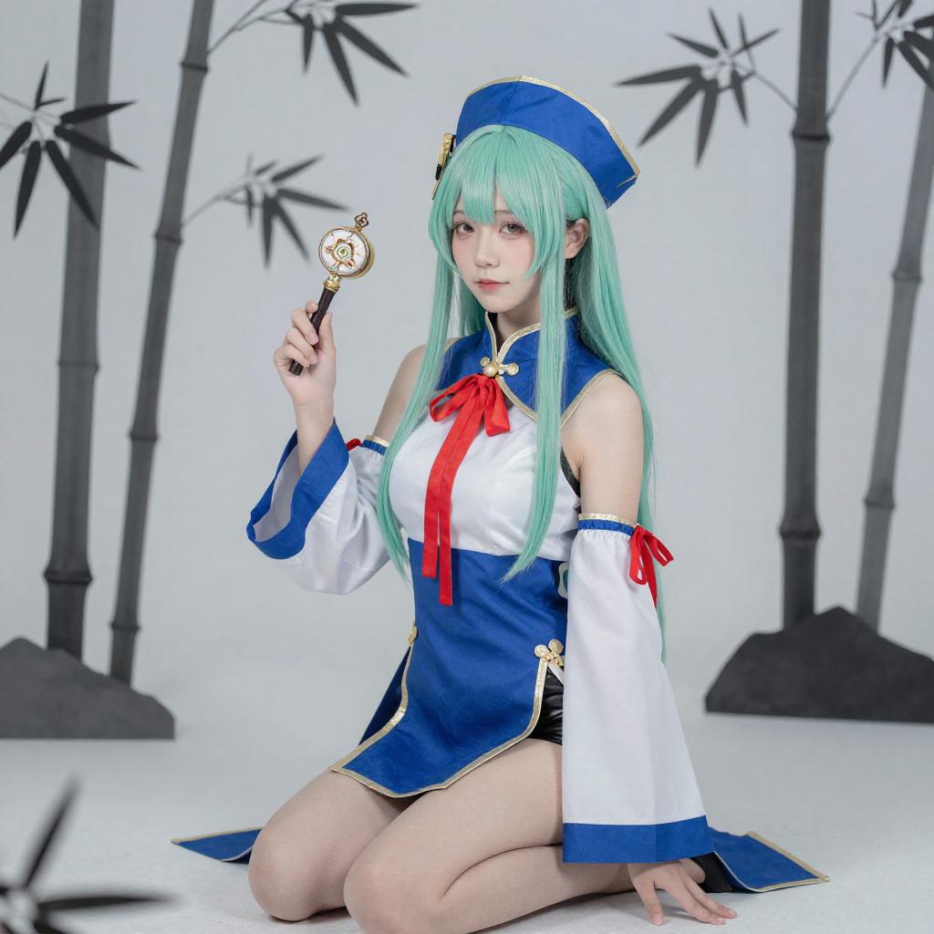 Photograph of a young woman with light green hair in a cosplay outfit, kneeling on a wooden floor. She wears a blue and white hat with a white symbol, and a white and blue sleeveless top with dark red accents. She holds a white cloth in front of her chest, looking directly at the camera with a slightly surprised expression. The background is a plain white wall.