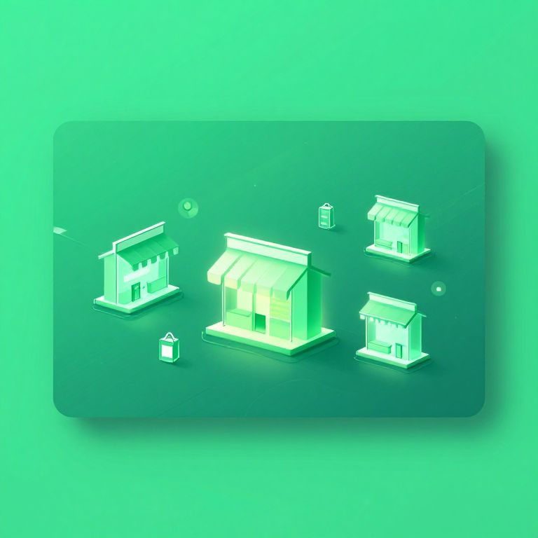 Digital illustration of four glowing white storefronts with awnings on a mint green background, featuring three shopping bags and two bubbles. Minimalist, futuristic style
