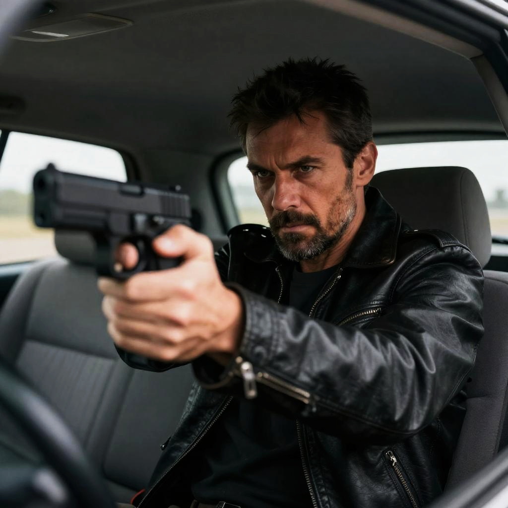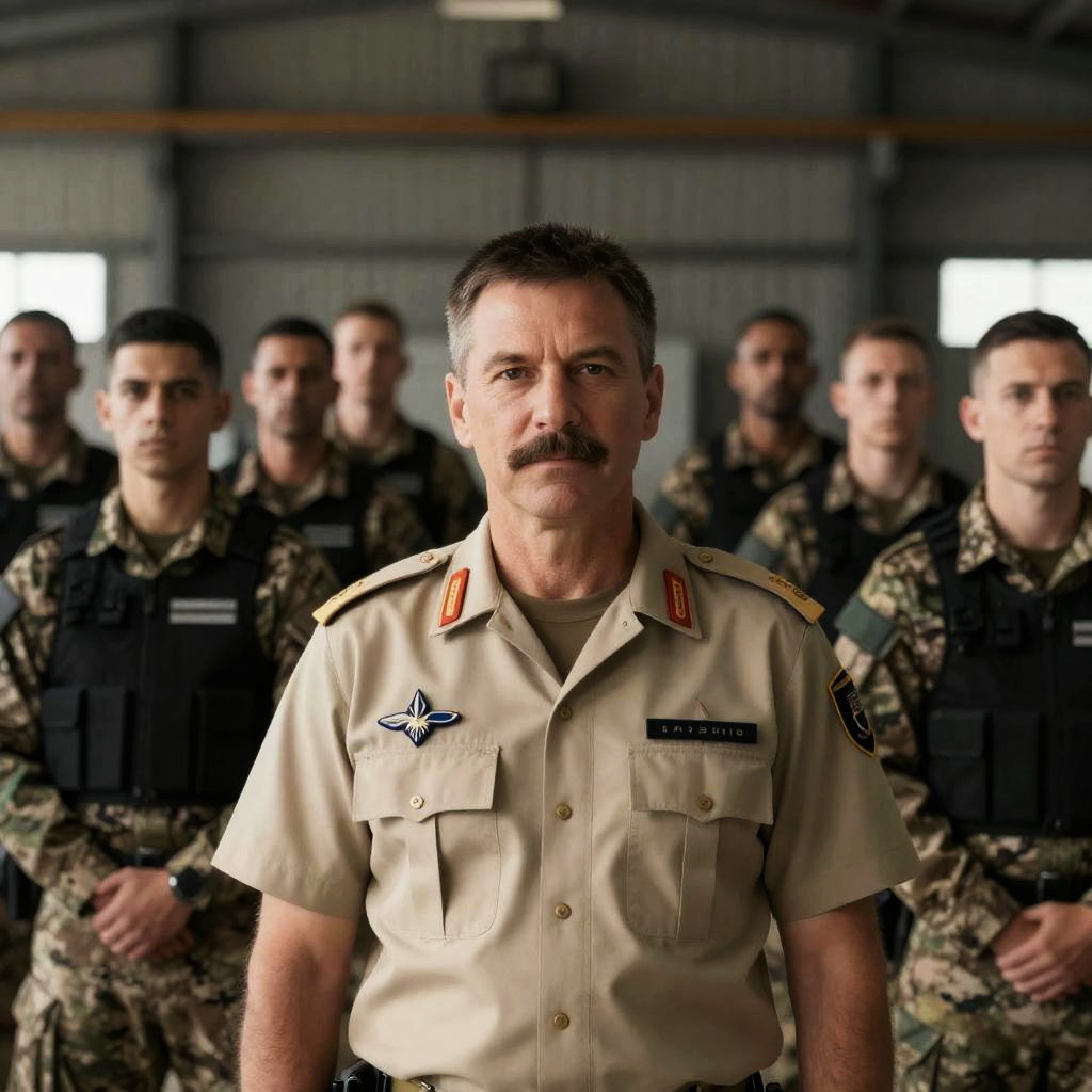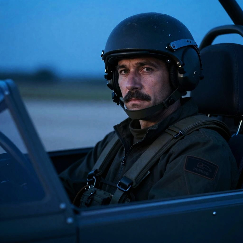 Portrait of a middle-aged male military pilot with a mustache, wearing a black flight helmet equipped with a headset and a dark tactical jacket with patches. He is seated inside the cockpit of an aircraft, looking intently forward. The scene is illuminated by soft blue lighting, with a blurred outdoor background visible through the cockpit window.