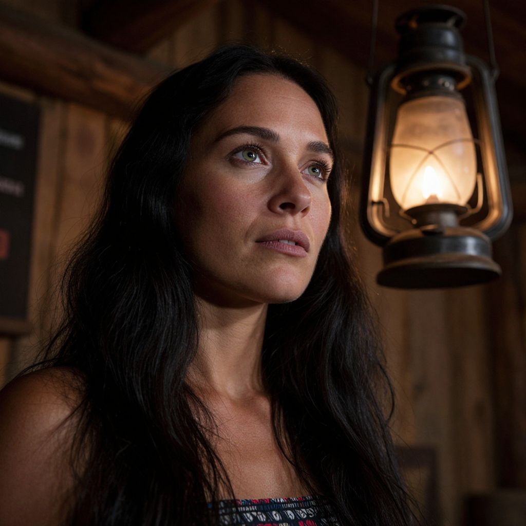 Photograph of a middle-aged woman with long, dark brown hair, olive skin, and brown eyes, gazing thoughtfully to the left. She wears a strapless, sparkly top. The background is a dimly lit wooden room with a hanging oil lantern illuminating her face with a warm glow. The lantern's light casts soft shadows on her face, highlighting her contemplative expression. The wooden walls and partial frame of a picture on the left add to the rustic ambiance. The image has a dramatic, moody atmosphere.